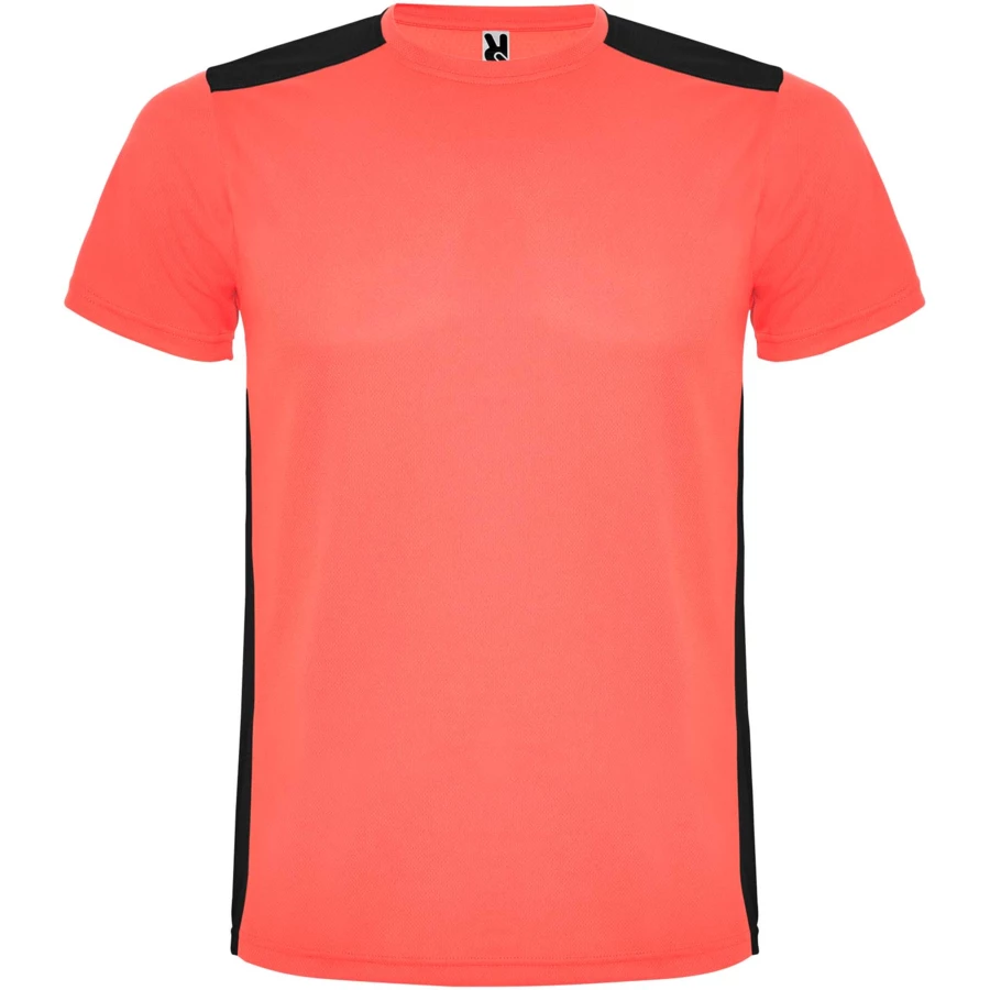 Łatwoschnący, techniczny i oddychający materiał. Okrągły kołnierzyk. Połączenie dwóch materiałów poliestrowych na plecach i ramionach. Materiał o splocie Birdseye z przodu i oddychająca siateczka 3D z tyłu. Materiał przygotowany na wchłanianie wilgoci. Ozdobny ścieg zygzakowy po bokach i na ramionach. Wzór na plecach nieco dłuższy. Usuwalna etykieta.