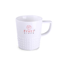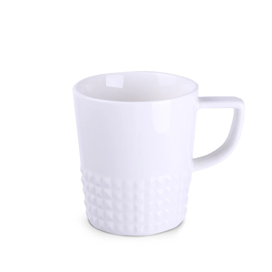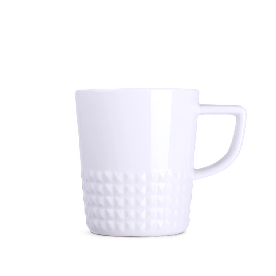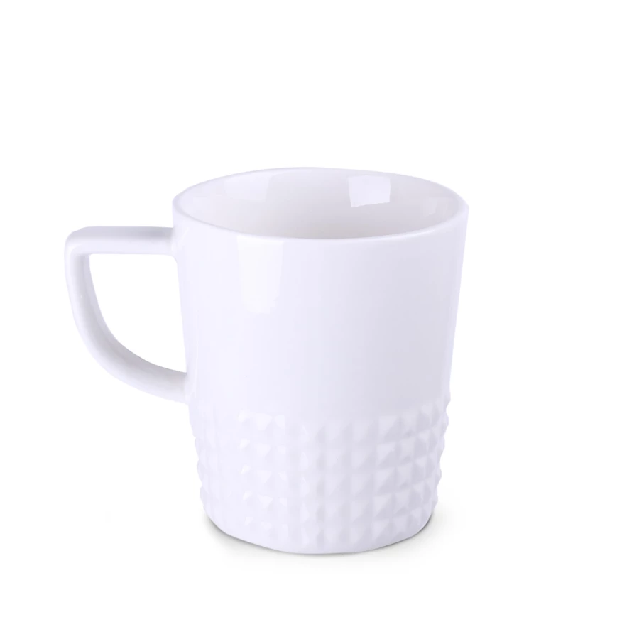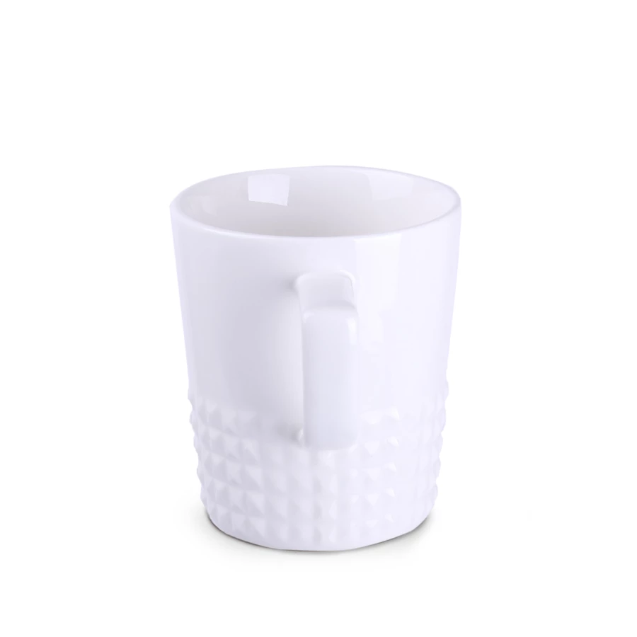Designerski elegancki kubek wykonany z wysokiej jakości porcelany. Posiada nowoczesne ucho oraz wypustki, które nadają mu wyjątkowego charakteru. Idealny do nanoszenia oryginalnych projektów.