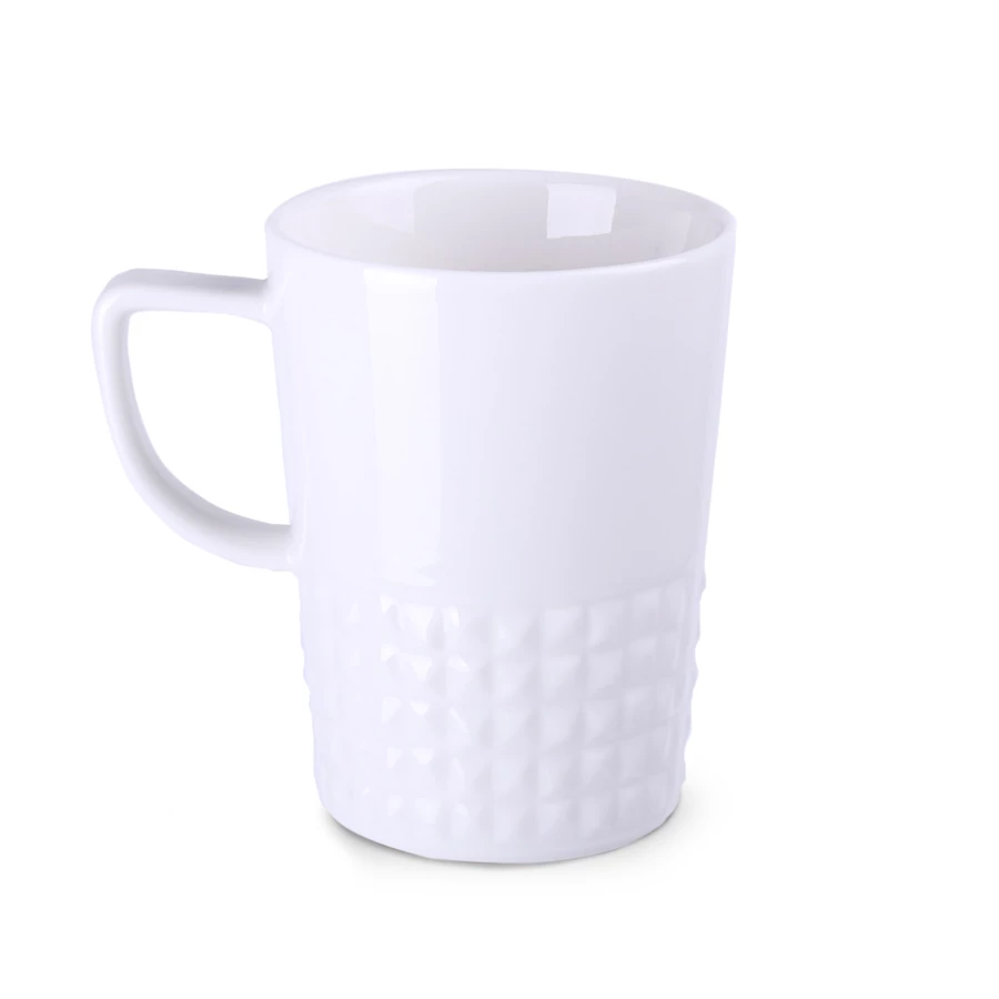 Designerski elegancki kubek wykonany z wysokiej jakości porcelany. Posiada nowoczesne ucho oraz wypustki, które nadają mu wyjątkowego charakteru. Idealny do nanoszenia oryginalnych projektów.