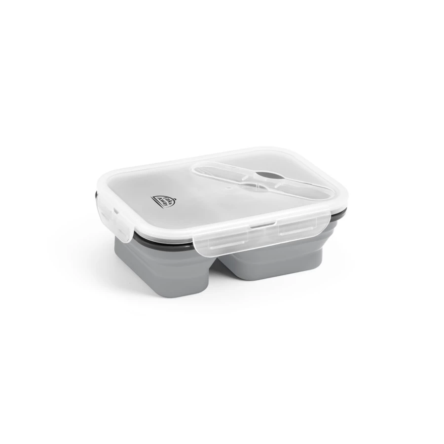 Wysuwane hermetyczne pudełko wykonane z silikonu i PP, z 2 przegrodami o pojemnościach do 480 mL i 760 mL. W górnej części wieczka znajduje się miejsce na przechowywanie dołączonego do zestawu widelca i noża (2 w 1). Nadaje się do użytku w kuchence mikrofalowej (należy zdjąć wieczko). 212 x 153 x 73 mm | Złożone: 212 x 153 x 38 mm