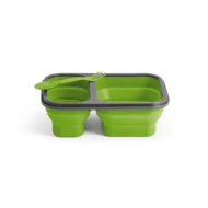 Wysuwane hermetyczne pudełko wykonane z silikonu i PP, z 2 przegrodami o pojemnościach do 480 mL i 760 mL. W górnej części wieczka znajduje się miejsce na przechowywanie dołączonego do zestawu widelca i noża (2 w 1). Nadaje się do użytku w kuchence mikrofalowej (należy zdjąć wieczko). 212 x 153 x 73 mm | Złożone: 212 x 153 x 38 mm