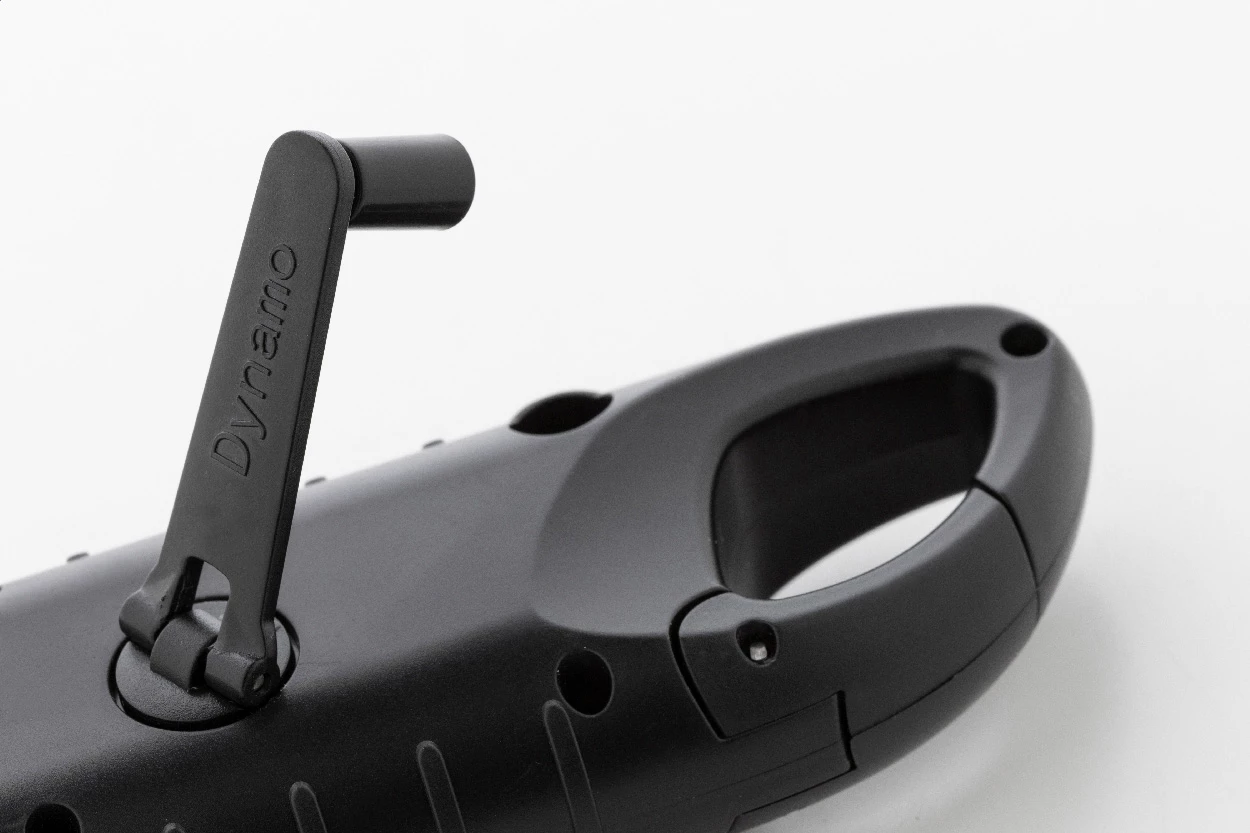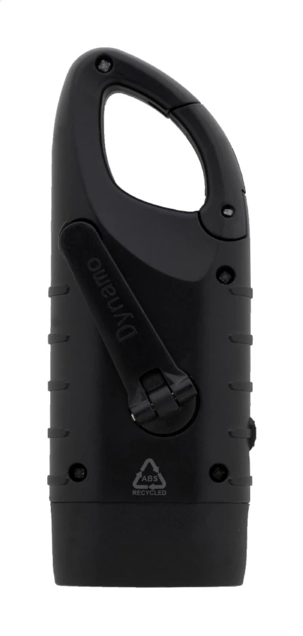 Latarka wykonana z recyklingowanego tworzywa ABS, z 3 diodami LED, wbudowaną ładowarką solarną i dynamem oraz karabińczykiem.