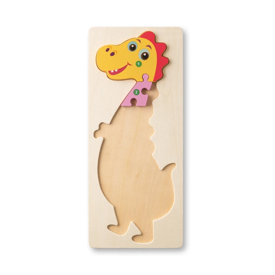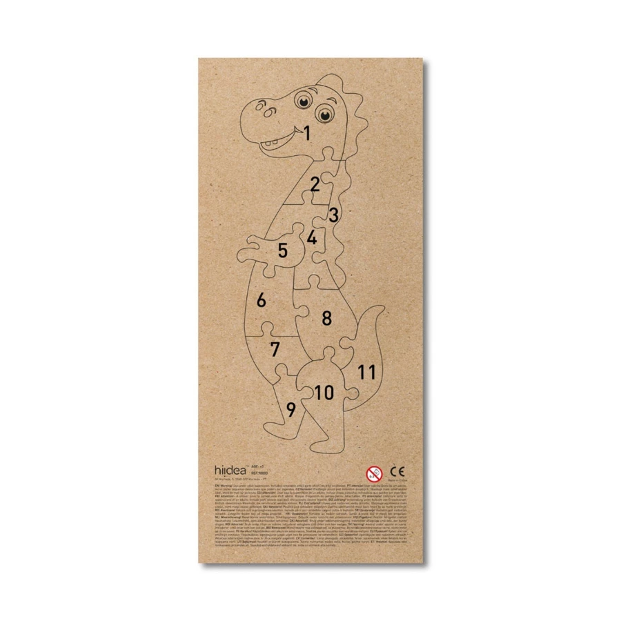 Puzzle w kształcie dinozaura ze sklejki sosnowej. Każda część jest ponumerowana, aby ułatwić montaż. Podstawa, również ze sklejki, ma możliwość personalizacji. Dostarczany w pudełku upominkowym z papieru kraft. Ponieważ produkt jest wykonany z naturalnych materiałów, kolor produktu oraz wynik drukowania mogą się różnić w zależności od produktu. 128 x 298 mm