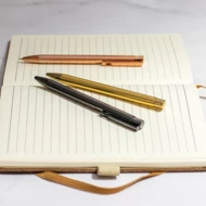 Długopis wykonany z aluminium o metalicznym połysku. Posiada wkład piszący na niebiesko.