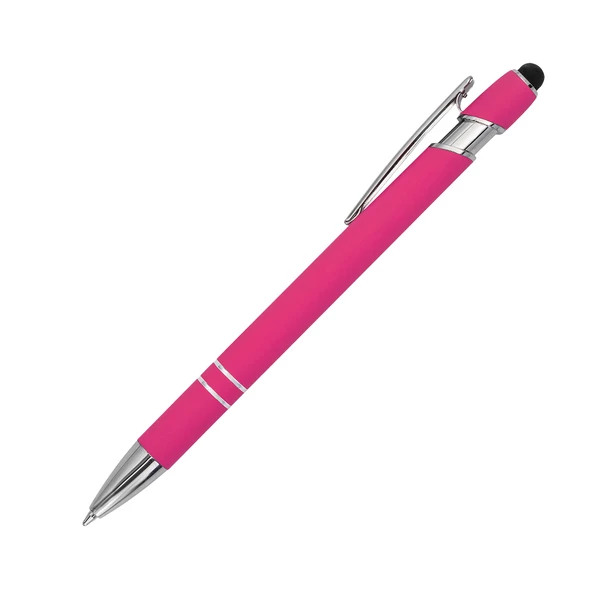 Aluminiowy długopis o przyjemnym w dotyku, satynowym wykończeniu ze srebrnymi elementami. Wyposażony w końcówkę do ekranów dotykowych. Niebieski wkład.