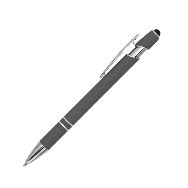 Aluminiowy długopis o przyjemnym w dotyku, satynowym wykończeniu ze srebrnymi elementami. Wyposażony w końcówkę do ekranów dotykowych. Niebieski wkład.