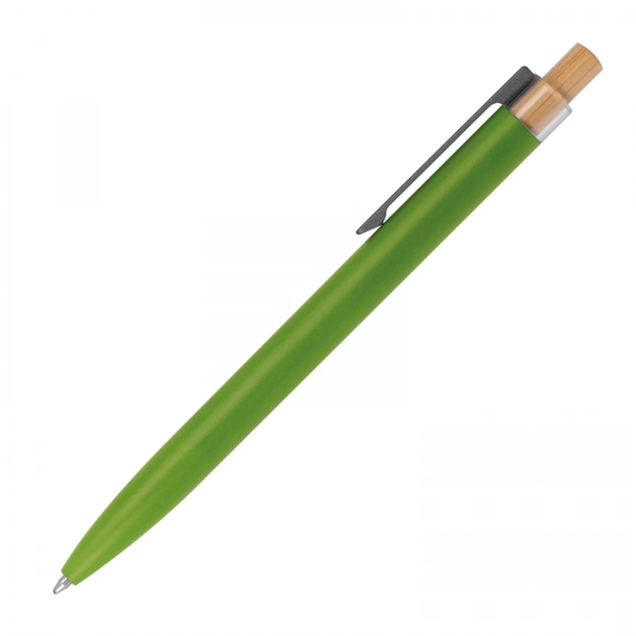 Długopis wykonany z aluminium pochodzącego z recyklingu, z niebieskim wkładem i bambusowym przyciskiem. Długopis wykonano z solidnego materiału, a dzięki odpowiedniemu ciężarowi, jest wyjątkowo wytrzymały i dobrze wyważony w dłoni. Powłoka długopisu gładka w dotyku, matowa.