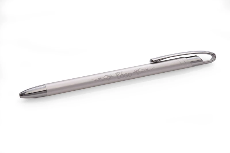 Cienki i zgrabny metalowy długopis w kolorze o metalicznym wykończeniu. Klip i końcówki w kolorze srebrnym chromowanym. AVALO wyróżnia się wśród podobnych długopisów oryginalnym projektem klipu. Korpus ozdobiony został dwoma skośnymi paskami w kolorze srebrnym. Wkład o grubości 0,7 mm w kolorze niebieskim.