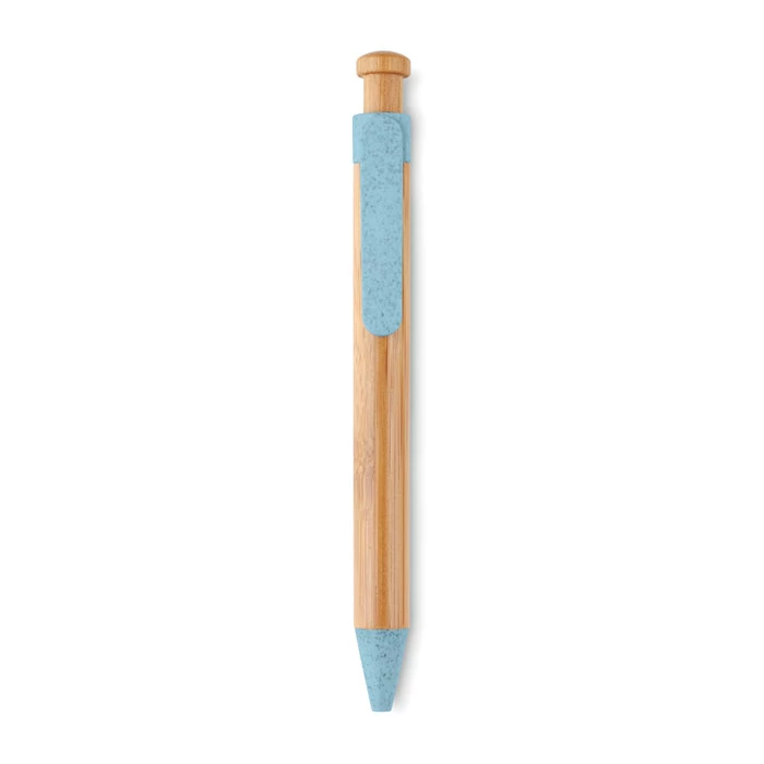 Przyciskany długopis z bambusa i słomy pszenicznej 50% oraz ABS 50% detali. Niebieski wkład. Bambus jest produktem naturalnym, dlatego mogą wystąpić nieznaczne różnice w kolorze, wzorze i rozmiarze. FSC®-certified | FSC 100%, N5.7, FSC-C213206