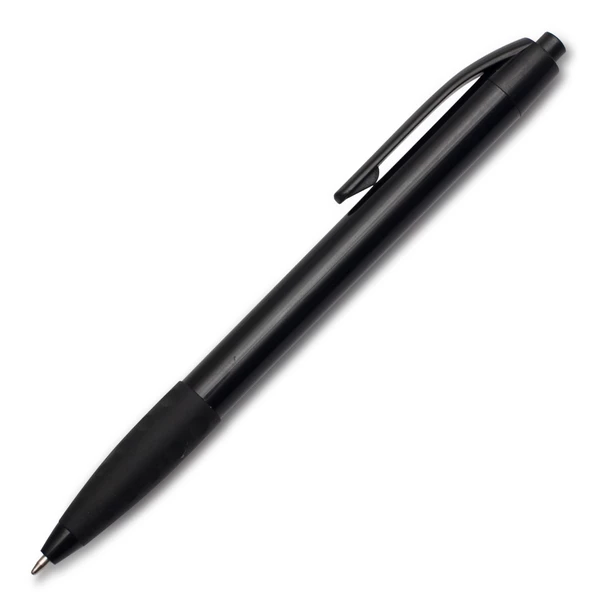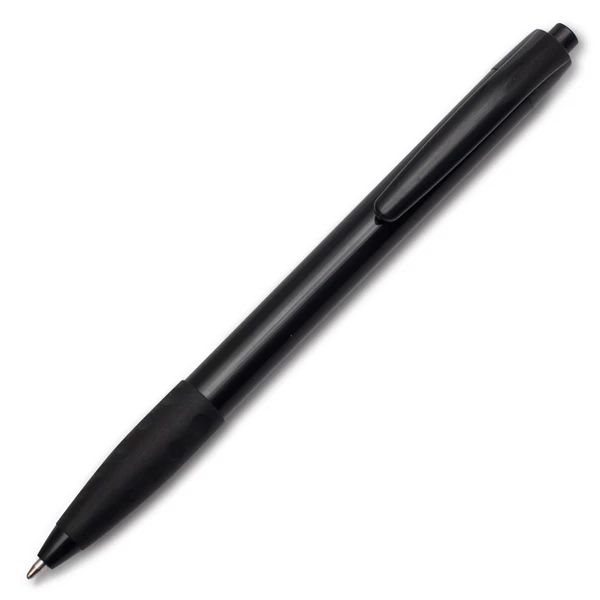 Plastikowy długopis promocyjny z gumowym uchwytem. Wkład w kolorze niebieskim.