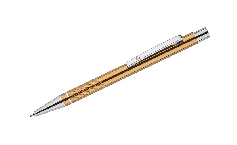 Długopis BONITO to elegancki metalowy długopis w metalicznych kolorach z chromowanymi wykończeniami. Wykonany z wysokiej jakości aluminium, korpus długopisu ozdobiony jest srebrnym ringiem oraz paskami o delikatnie chropowatej strukturze. Długopis wyposażony jest w wkład z tuszem półżelowym w kolorze czarnym o grubości 0,7 mm.