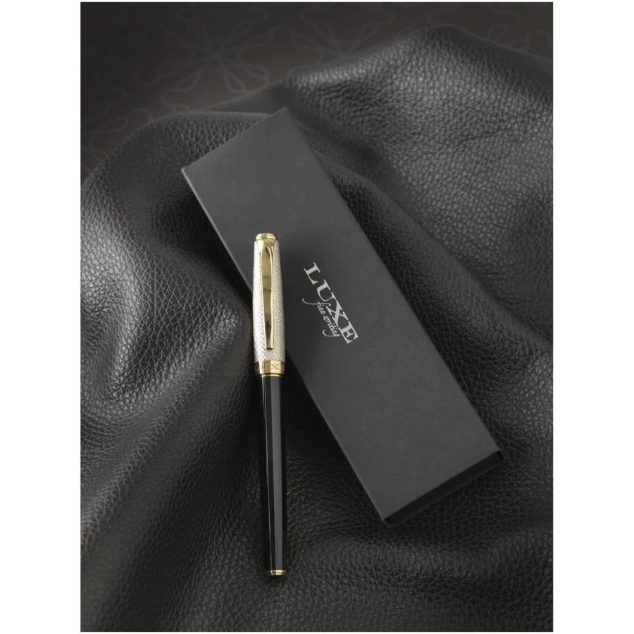 Luksusowe pióro kulkowe, ze złotą skórzaną zatyczką i lakierowanymi złotymi elementami, zapakowane w pudełko upominkowe Luxe. Dolny korpus wykonany jest z lakierowanego mosiądzu, a górny z mosiądzu i PU. Pióro kulkowe: 14 cm x 1,15 cm, waga: 32 gr, żywotność: 500 m.