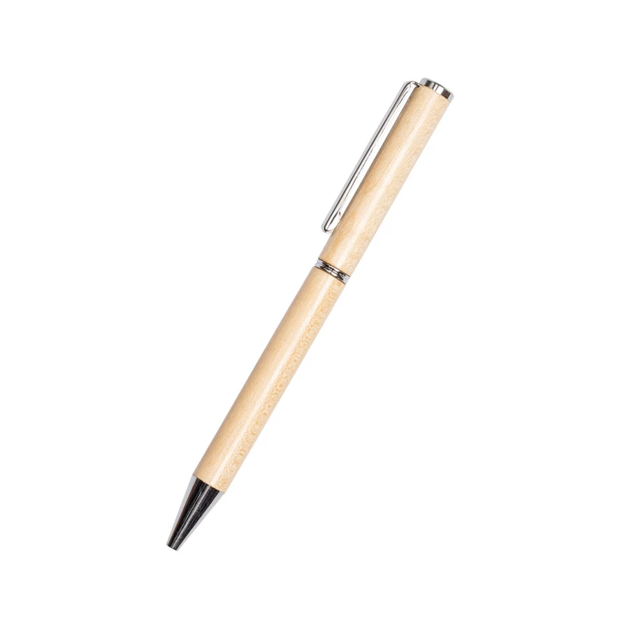 Automatyczny długopis do produkcji, którego użyto drewna klonowego jest w 100% ekologiczny. Posiada metalowe elementy, piszę na niebiesko. Długopis pakowany jest w tekturowe pudełko.