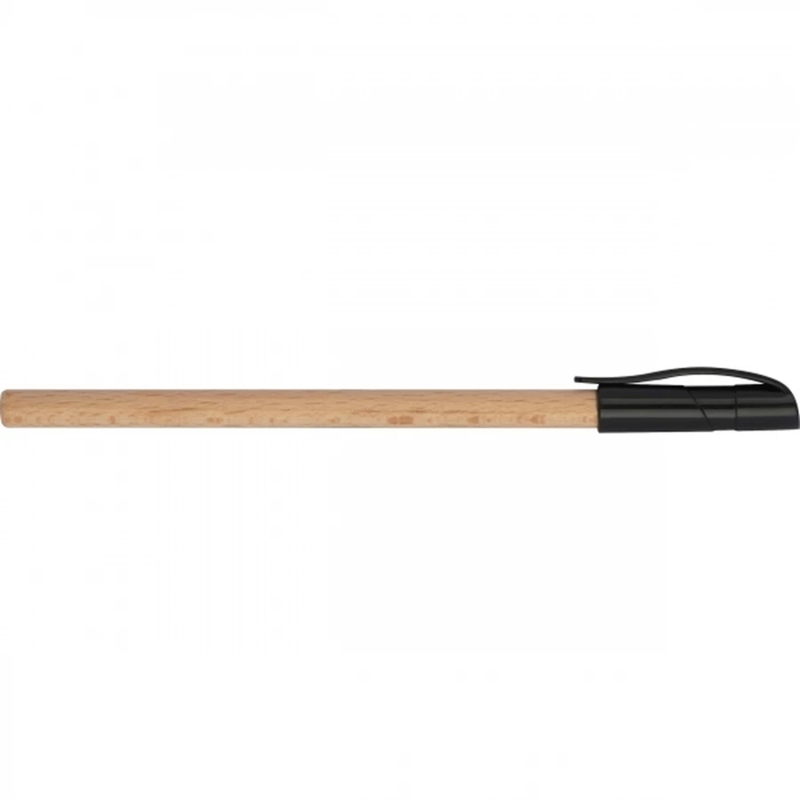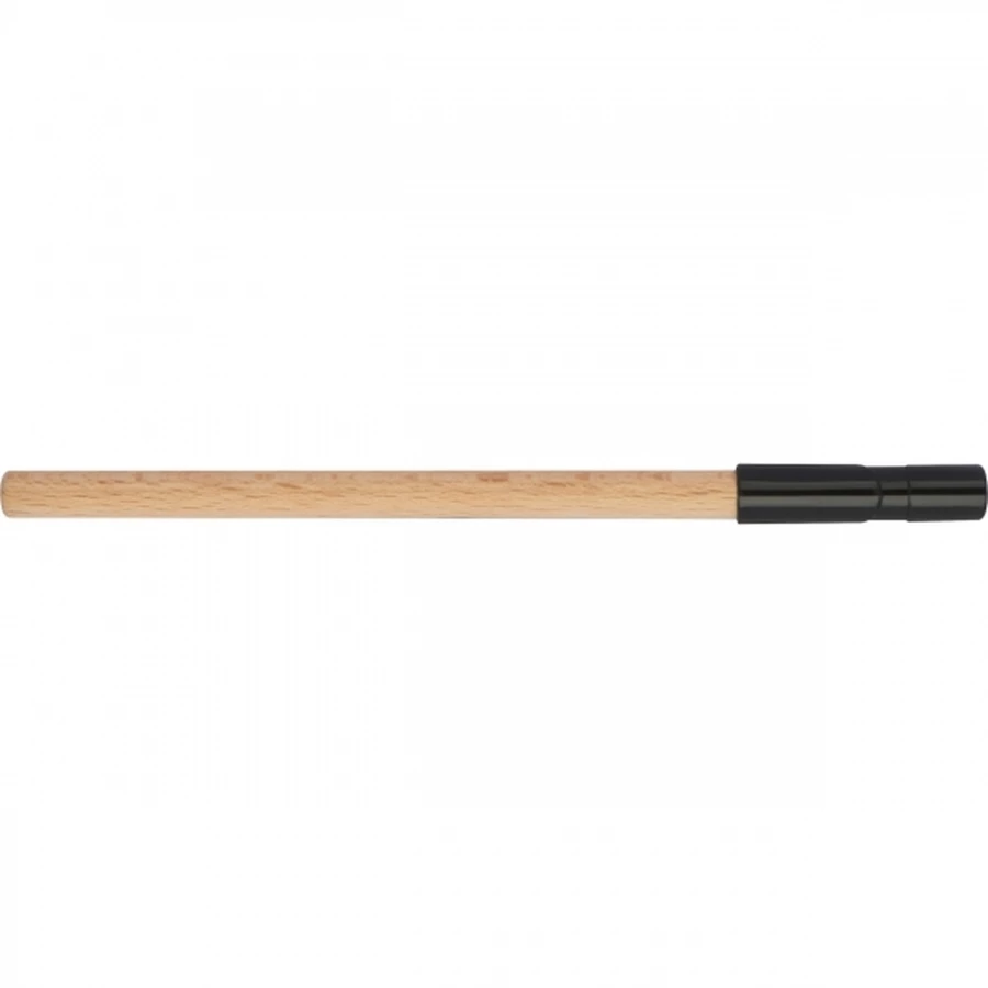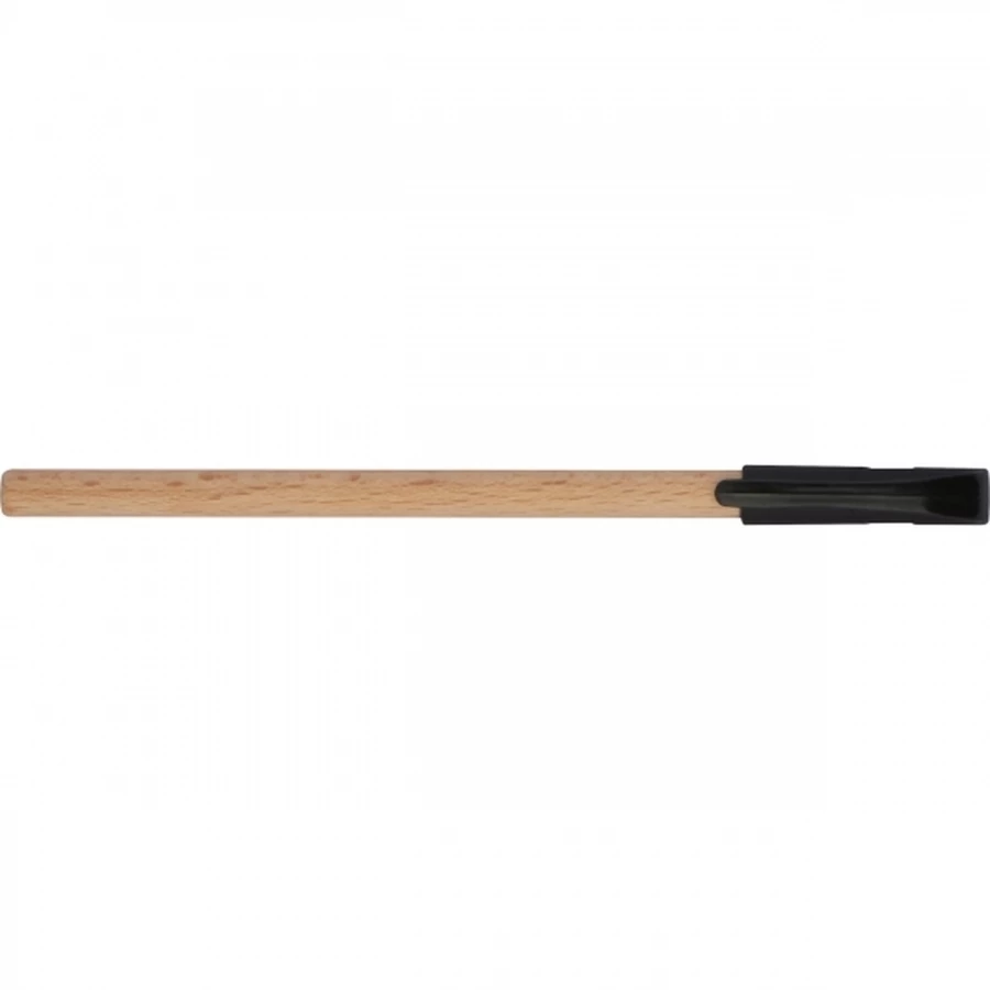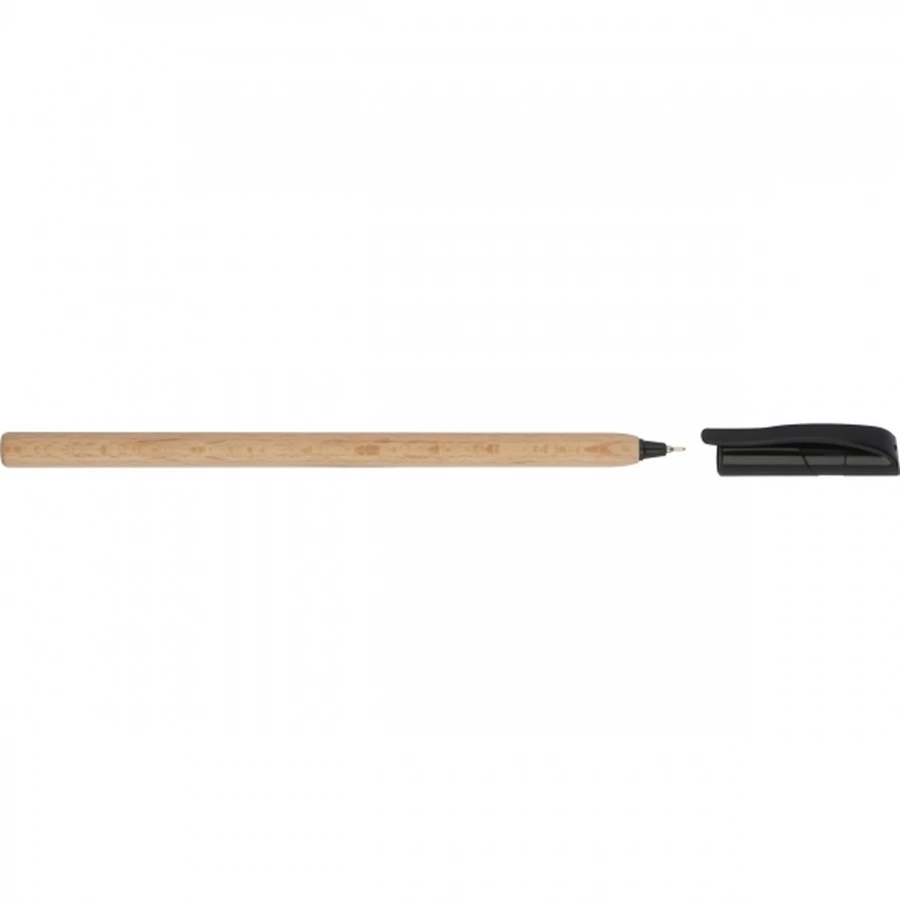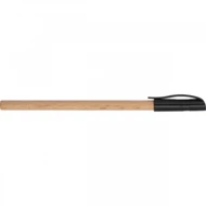 Jednorazowy długopis wyprodukowany z drewna, piszący na czarno. Długopis bez możliwości wymiany wkładu, wyposażony w czarną plastikową zatyczkę.