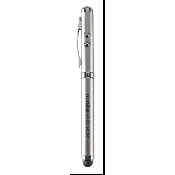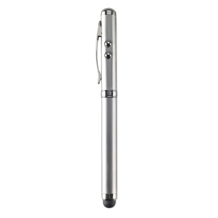 Wielofunkcyjny metalowy długopis: latarka LED (białe światło), wskaźnik laserowy (czerwony) i miękka końcówka. W metalowym pudełku. Czarny wkład. 3 baterie zegarkowe dołączone.