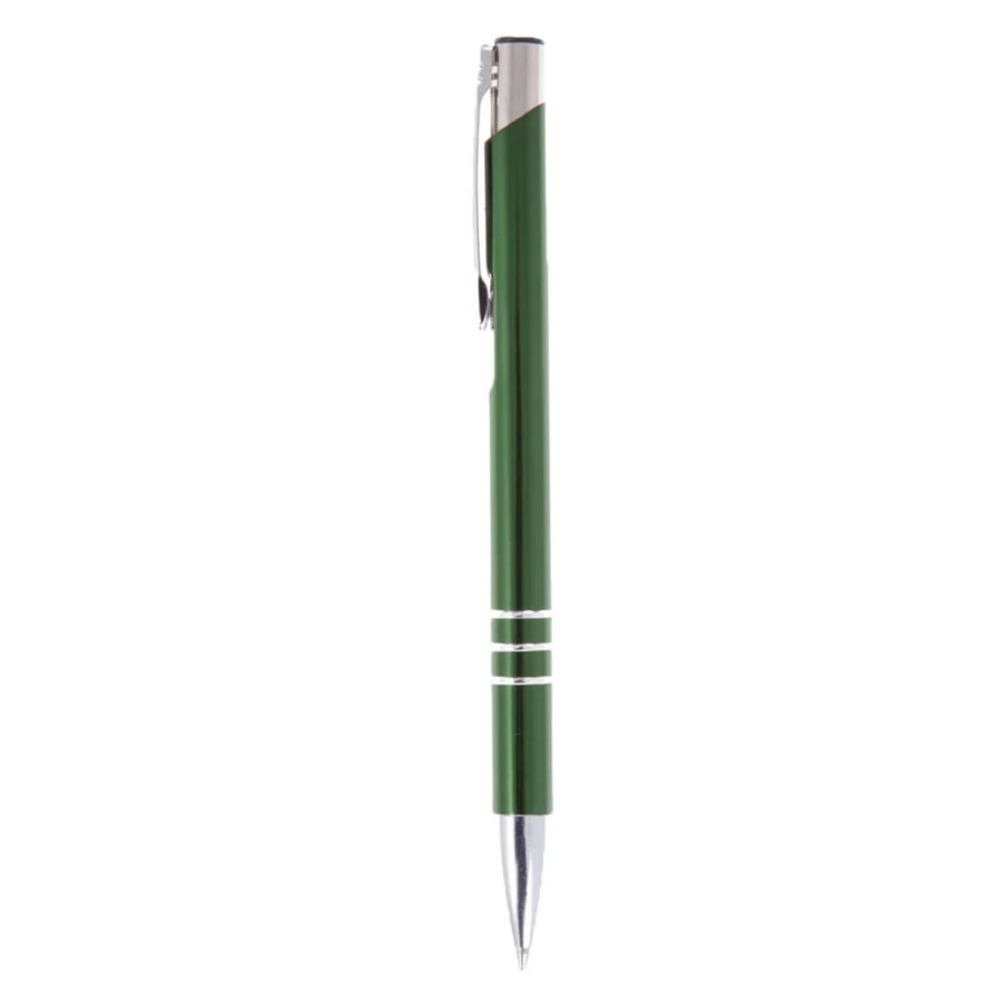 Długopis z kolorowym trzonem o błyszczącym wykończeniu, posiada elementy w srebrnym kolorze, wkład w niebieskim kolorze, produkt wykonany z aluminium