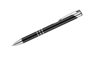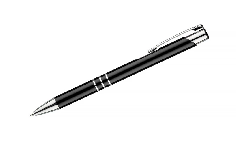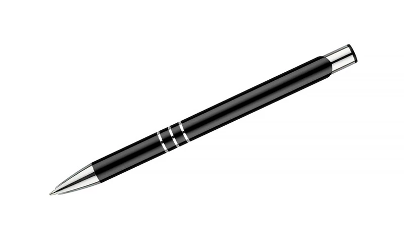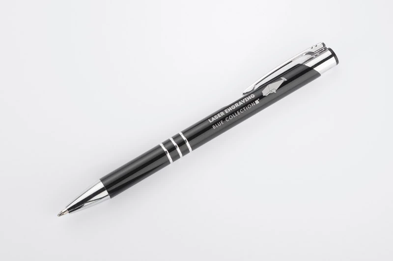 Metalowy długopis o metalizowanej chromowanej powierzchni. Długopis automatyczny z 3 ringami i niebieskim wkładem. Logo grawerujemy na powierzchni długopisu.