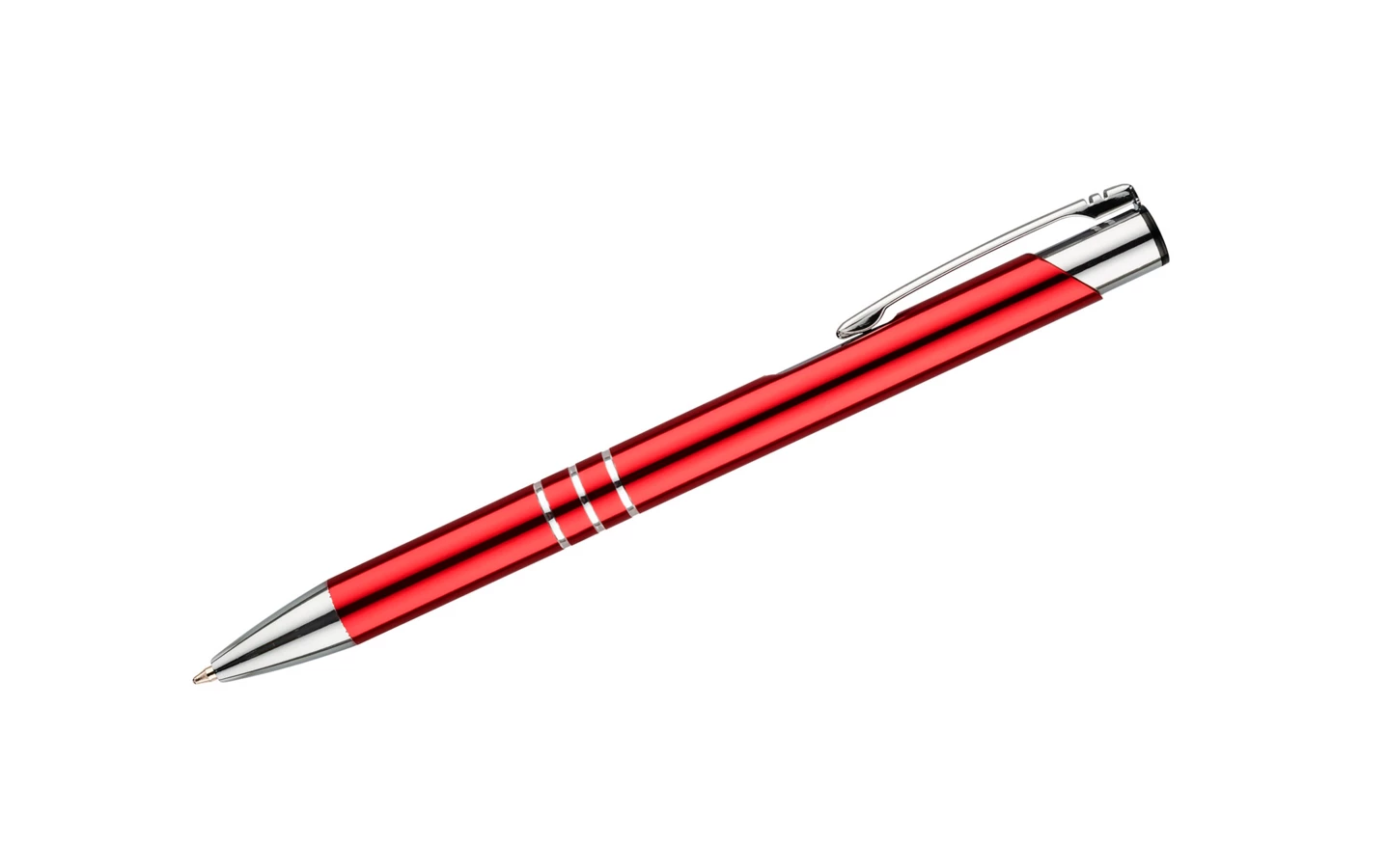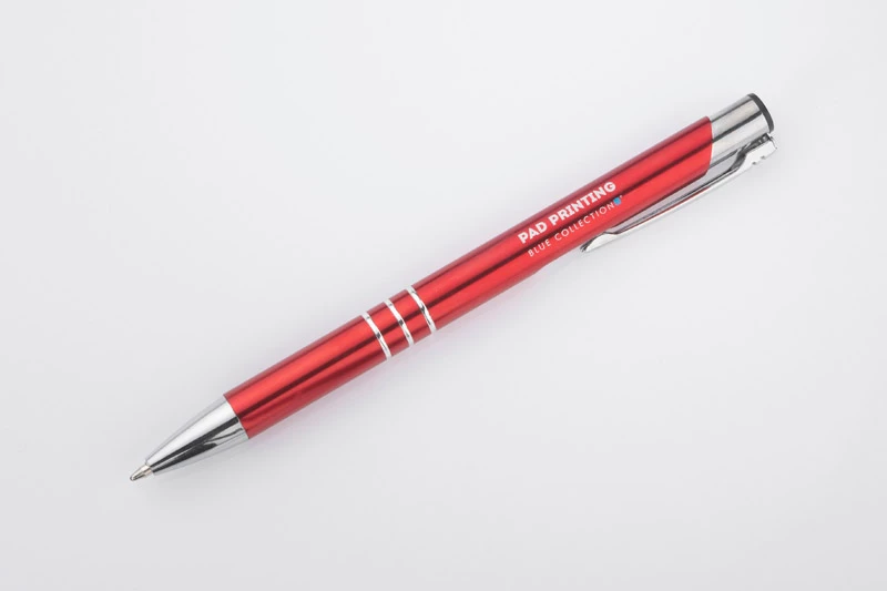 Metalowy długopis o metalizowanej chromowanej powierzchni. Długopis automatyczny z 3 ringami i niebieskim wkładem. Logo grawerujemy na powierzchni długopisu.