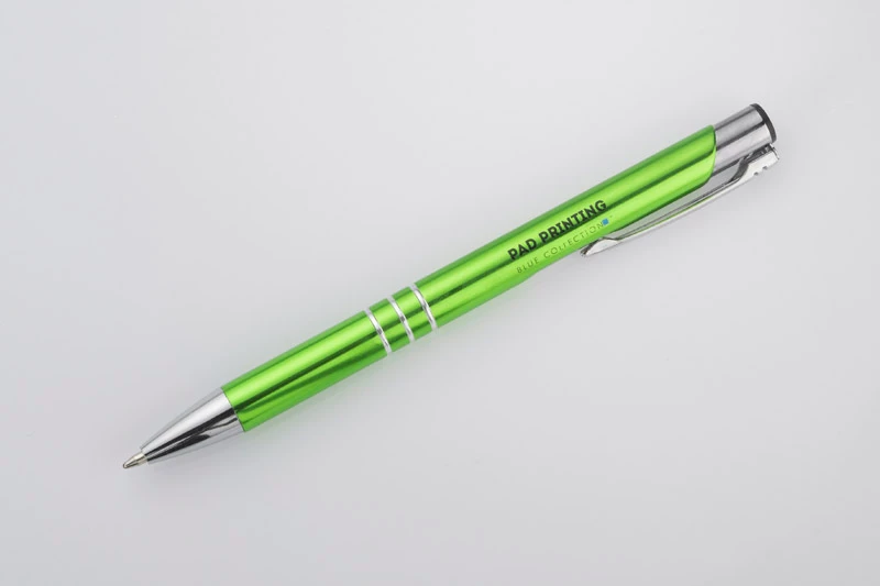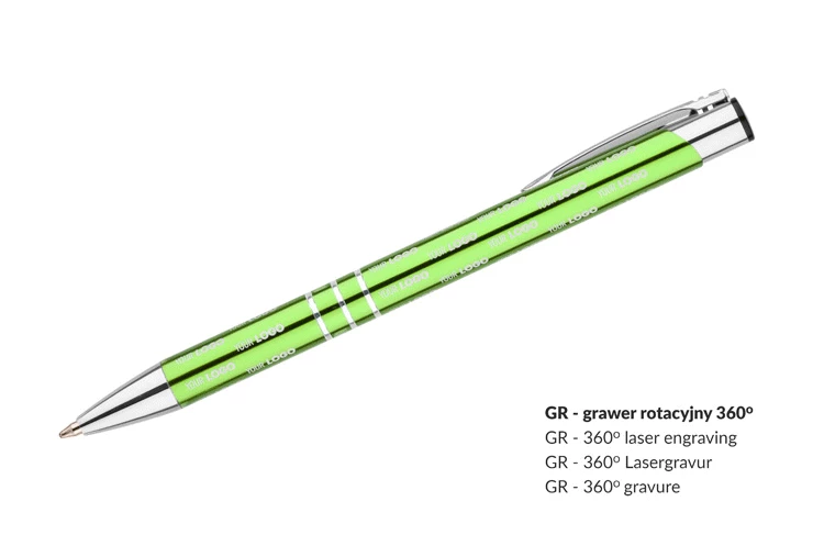 Metalowy długopis o metalizowanej chromowanej powierzchni. Długopis automatyczny z 3 ringami i niebieskim wkładem. Logo grawerujemy na powierzchni długopisu.