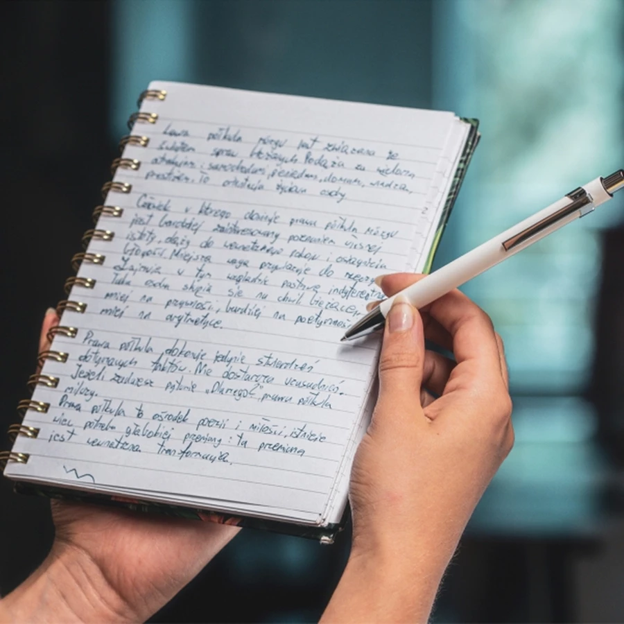 Długopis metalowy z wkładem o dużej pojemności piszącym na niebiesko.
