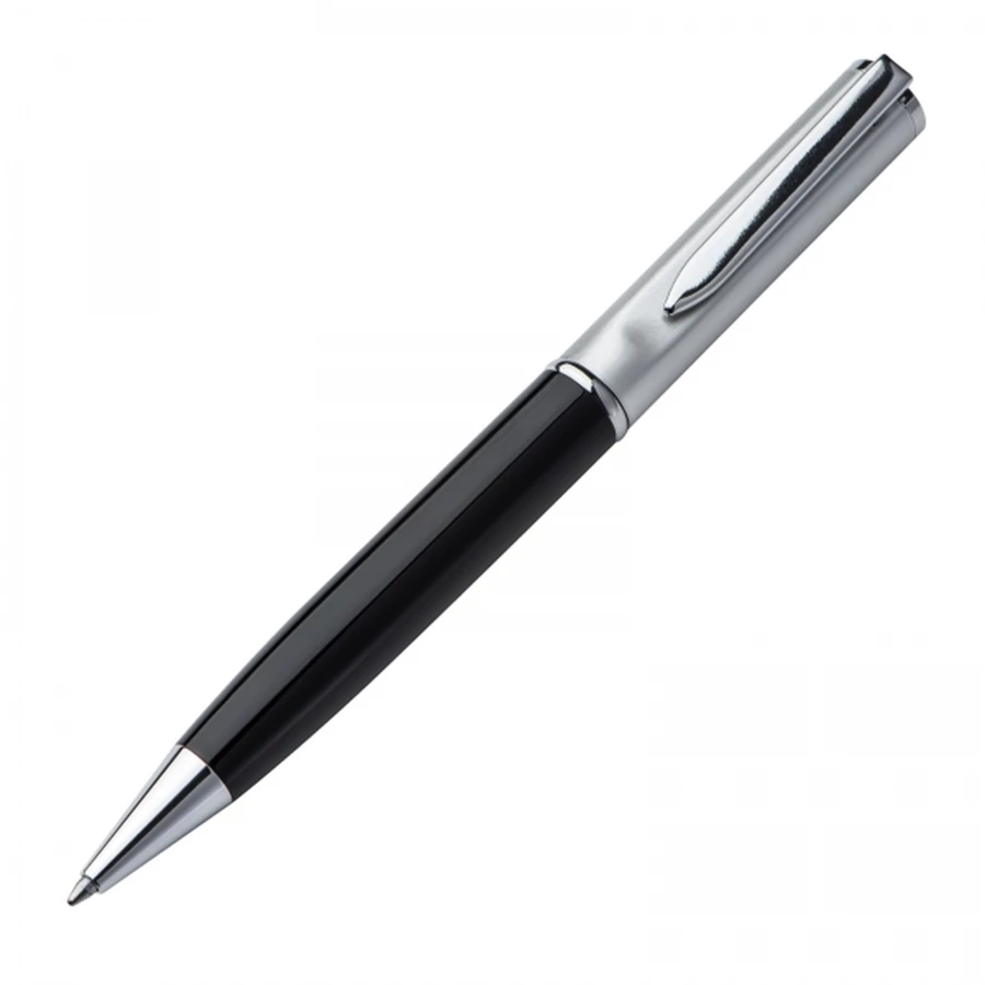 Długopis metalowy ze srebrnym wykończeniem i niebieskim wkładem o dużej pojemności. Zapakowany w kartonowe pudełko.
