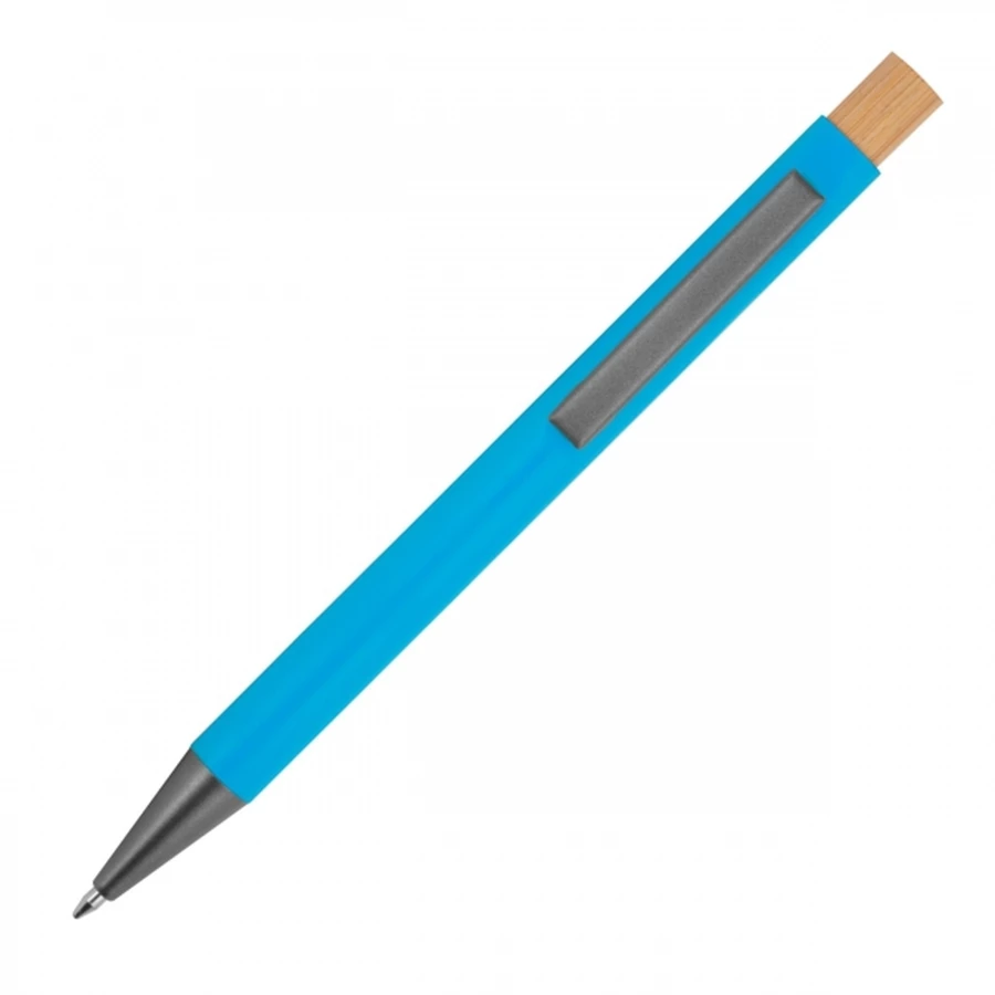 Długopis wykonany z aluminium z recyklingu, bambusowym przyciskiem, metalowym klipsem i wkładem piszącym na niebiesko.
