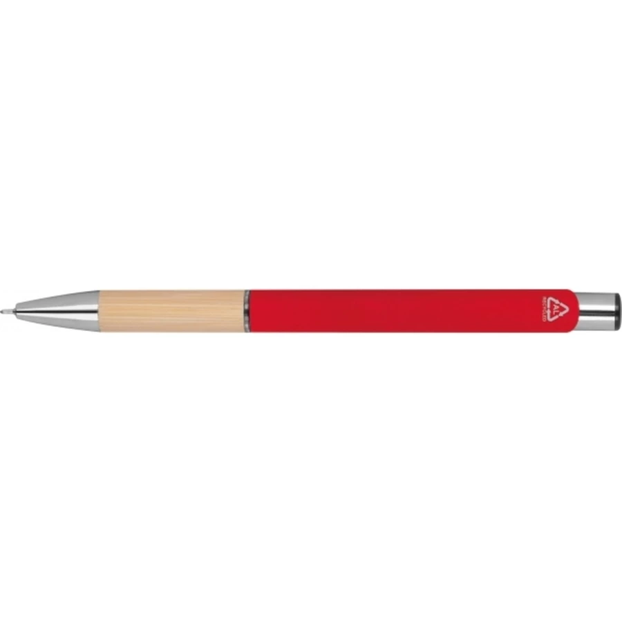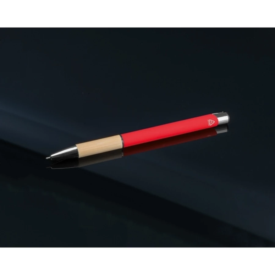 Piszący na niebiesko, półżelowy długopis wykonany z aluminium pochodzącego z recyklingu ze srebrnymi elementami i bambusową strefą uchwytu.