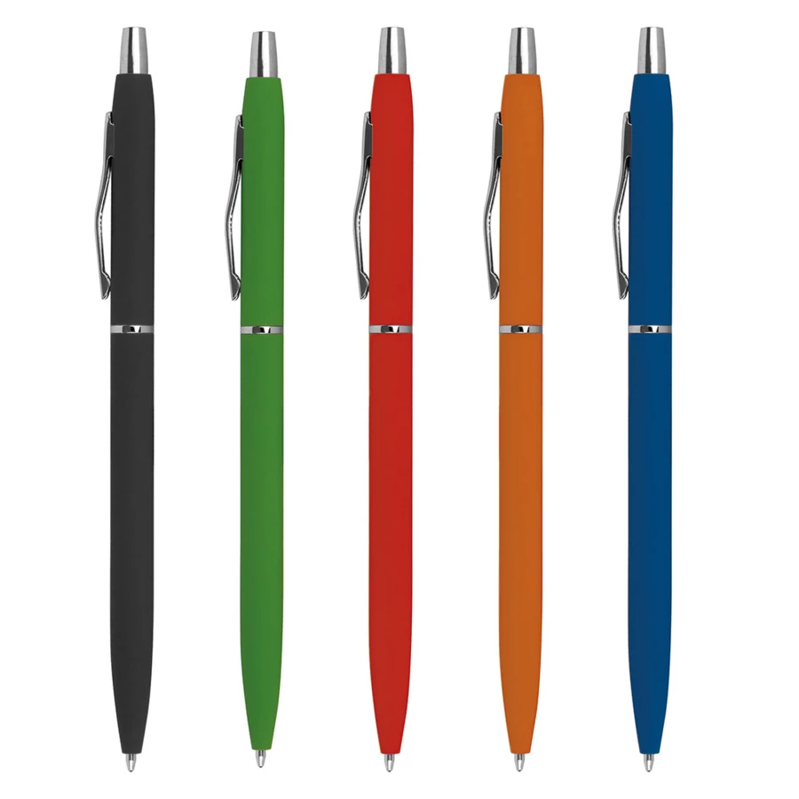 Smukły, gumowany długopis metalowy z wkładem piszącym na niebiesko.