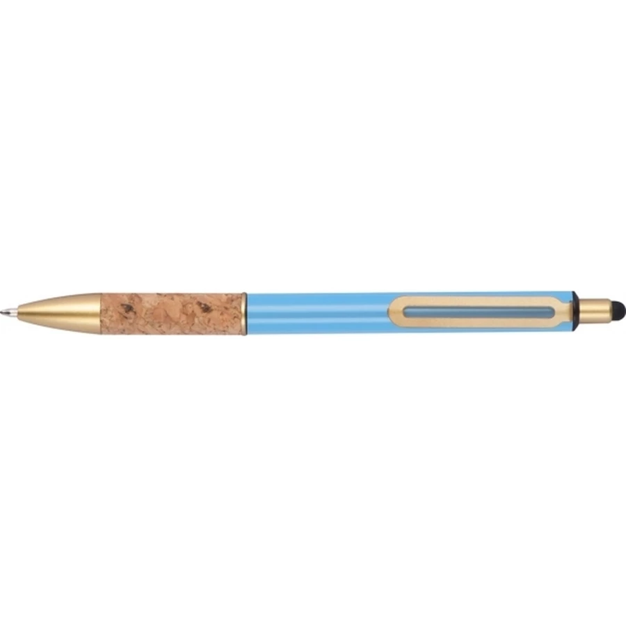 Metalowy długopis ze złotymi elementami i korkową strefą uchwytu. Długopis pisze na niebiesko.