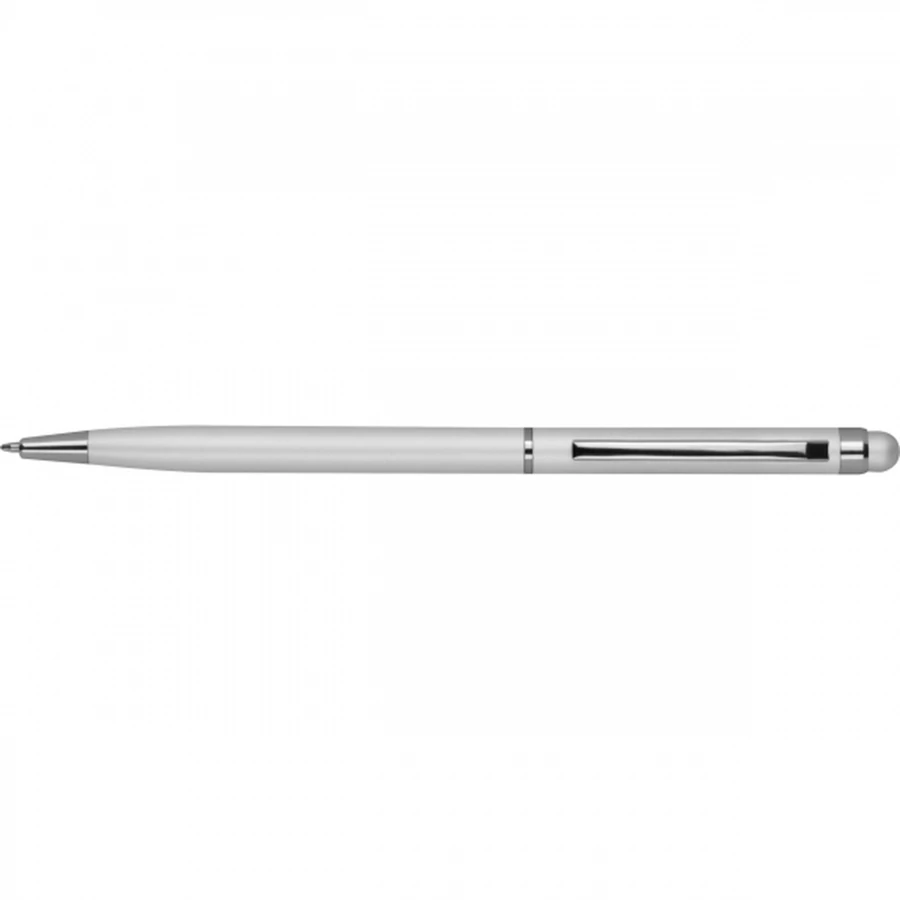 Metalowy długopis z niebieskim wkładem z tworzywa sztucznego i dopasowaną kolorystycznie funkcją dotykową nad klipsem.