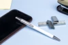 Długopis z aluminium z gumowaną powierzchnią. Posiada wkład piszący na niebiesko i końcówkę do obsługi ekranów dotykowych.