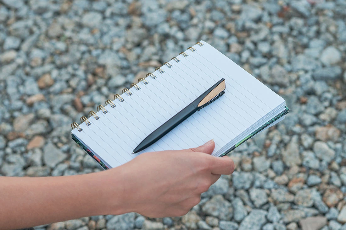 Matowy, przekręcany długopis wykonany z metalu z bambusowymi akcentami. Posiada niebieski wkład.