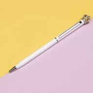 Metalowy długopis z mechanizmem obrotowym, zakończony koroną i kryształkiem Swarovskiego. Wkład pisze na niebiesko.