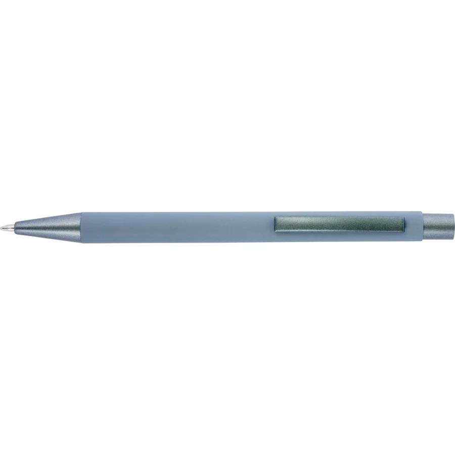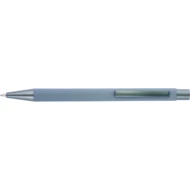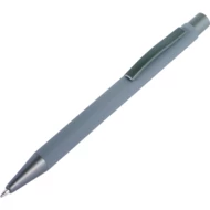 Długopis z kolorowym, gumowanym trzonem i szarymi elementami, grawer ukazuje lustrzaną powierzchnię