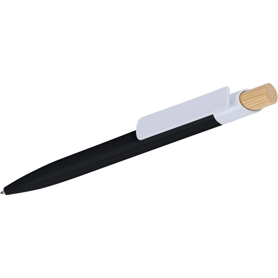 Długopis, bambusowy przycisk, metalowy klips, wkład w niebieskim kolorze, ikona recyklingu na produkcie, wystarcza na ok. 600 m pisania, produkt wykonany z ABS z recyklingu, aluminium i bambusa