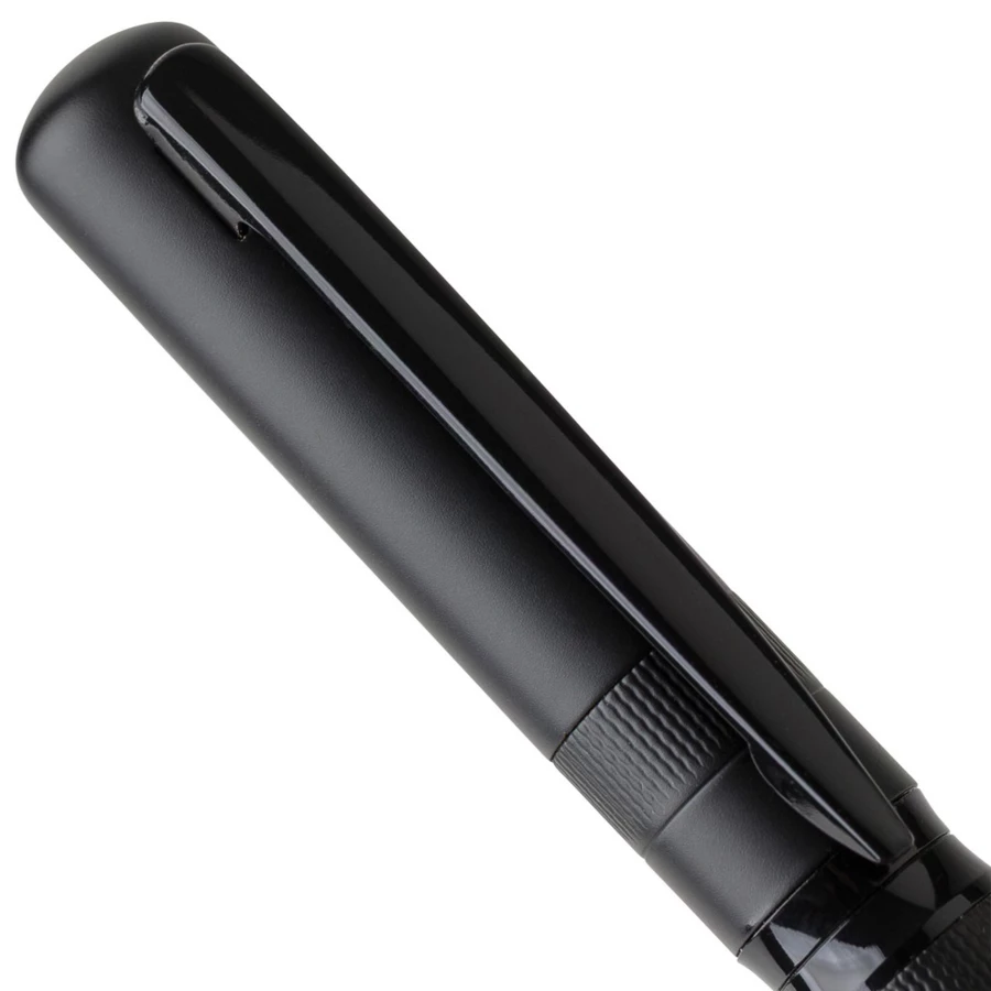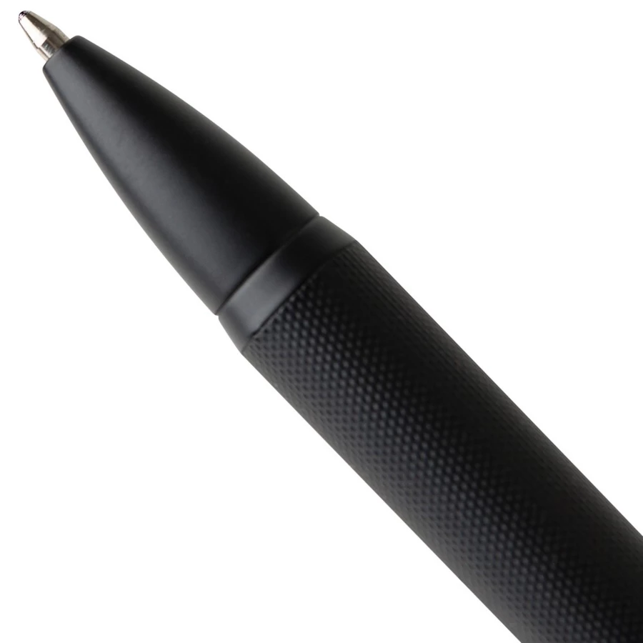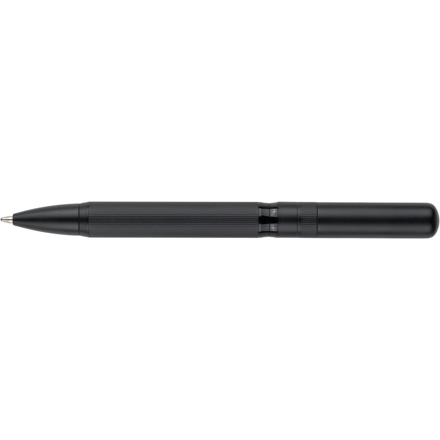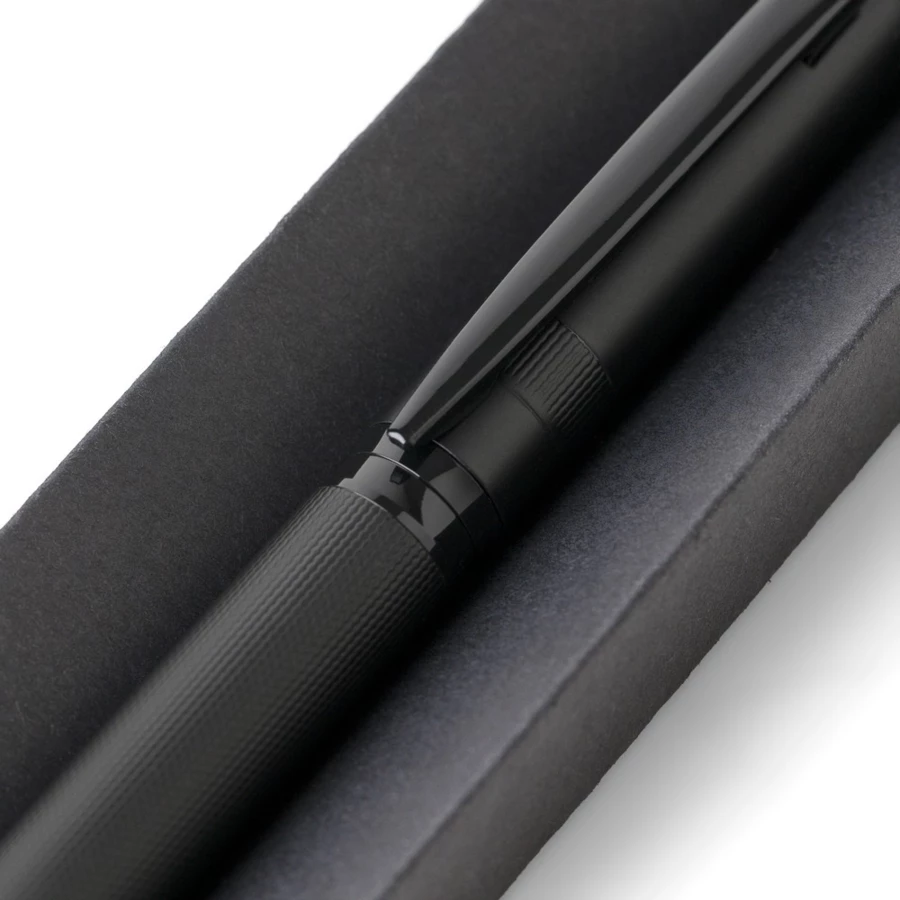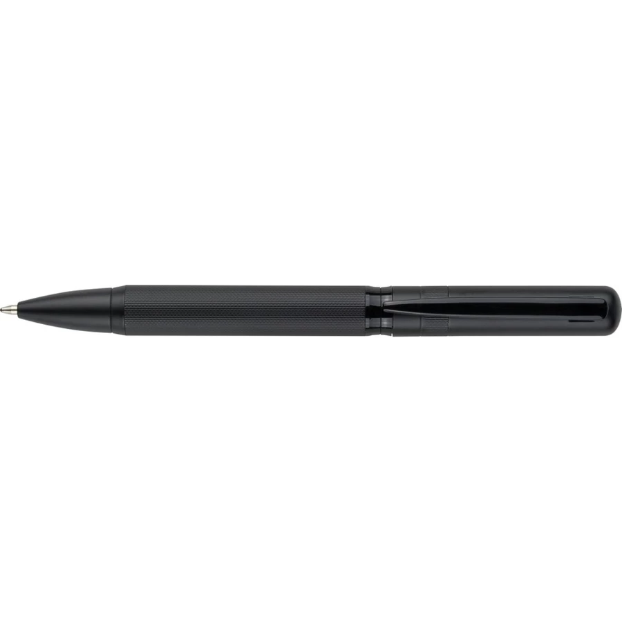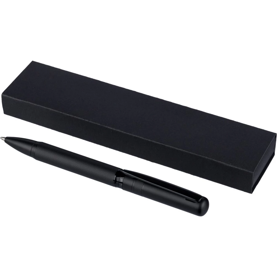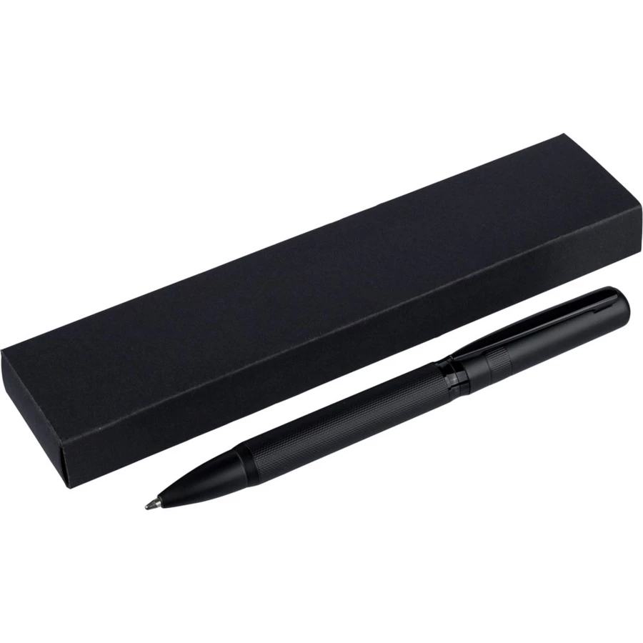 Długopis przekręcany, wkład w niebieskim kolorze, wystarcza na ok. 1000 m pisania, zapakowany pojedynczo w czarny kartonik, produkt wykonany z metalu