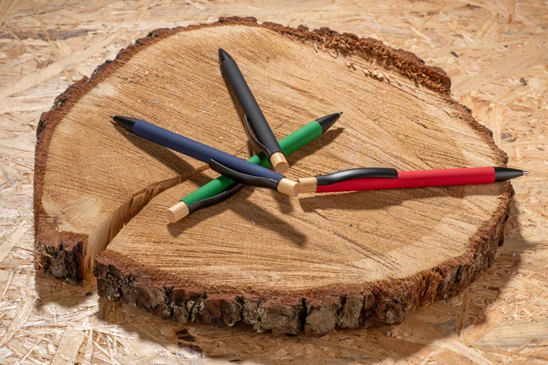 Długopis PIK to elegancki i funkcjonalny przyrząd piśmienniczy. Wykonany z metalu, oferuje solidność i trwałość, a gumowana powierzchnia "soft touch" zapewnia komfort i przyjemność podczas pisania. Wyposażony w klips umożliwiający przypięcie długopisu do kieszeni lub notesu. Dodatkowo, górna część długopisu wyposażona jest w bambusowy przycisk, co dodaje naturalnego i stylowego akcentu. Długopis PIK to idealne połączenie nowoczesnego designu z ekologicznym elementem, co sprawia, że jest doskonałym wyborem zarówno do codziennego użytku, jak i na prezent.