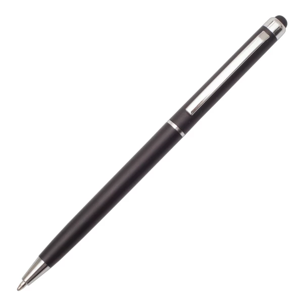 Długopis z końcówką przystosowaną do ekranów dotykowych. Korpus wykonany z plastiku, skuwka z metalu. Wkład w kolorze niebieskim. Posiada obrotowy mechanizm włączania.