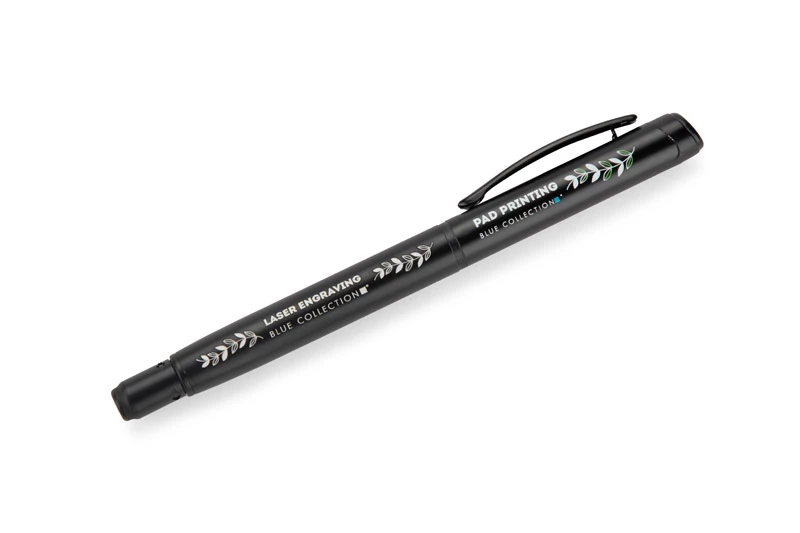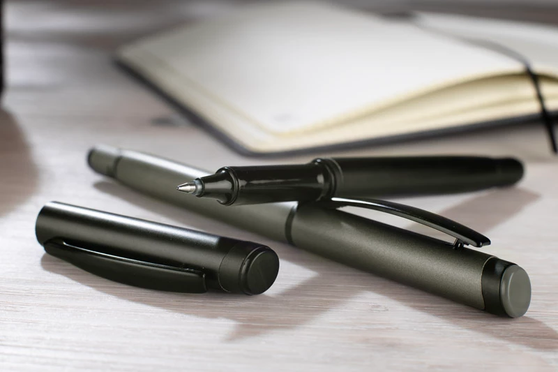 Długopis ROTIS to aluminiowy model z żelowym wkładem typu free ink, zamykany klasyczną zatyczką. Korpus o półmatowym wykończeniu uzupełnia czarny, metalowy klips, który dodaje elegancji. Obrotowa końcówka z wbudowanym spinnerem pełni funkcję antystresową – umieszczona na niej czarna strzałka, wytłoczona w materiale, subtelnie sugeruje kierunek obrotu.