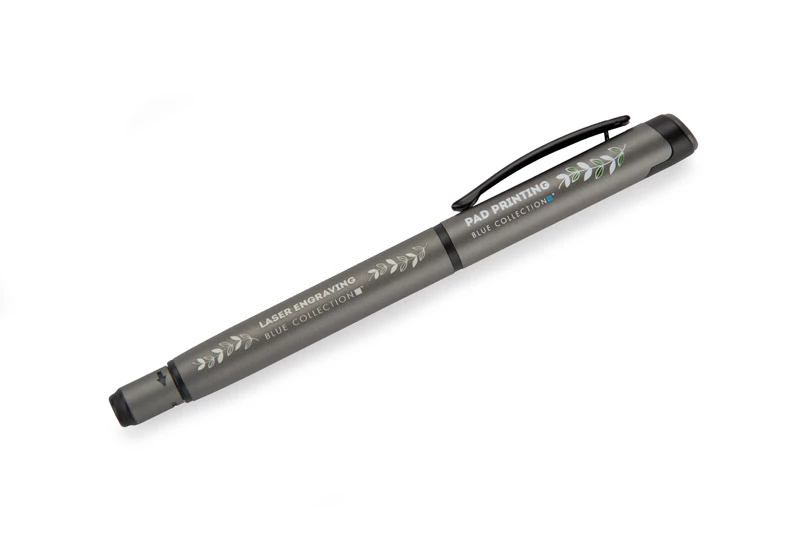 Długopis ROTIS to aluminiowy model z żelowym wkładem typu free ink, zamykany klasyczną zatyczką. Korpus o półmatowym wykończeniu uzupełnia czarny, metalowy klips, który dodaje elegancji. Obrotowa końcówka z wbudowanym spinnerem pełni funkcję antystresową – umieszczona na niej czarna strzałka, wytłoczona w materiale, subtelnie sugeruje kierunek obrotu.