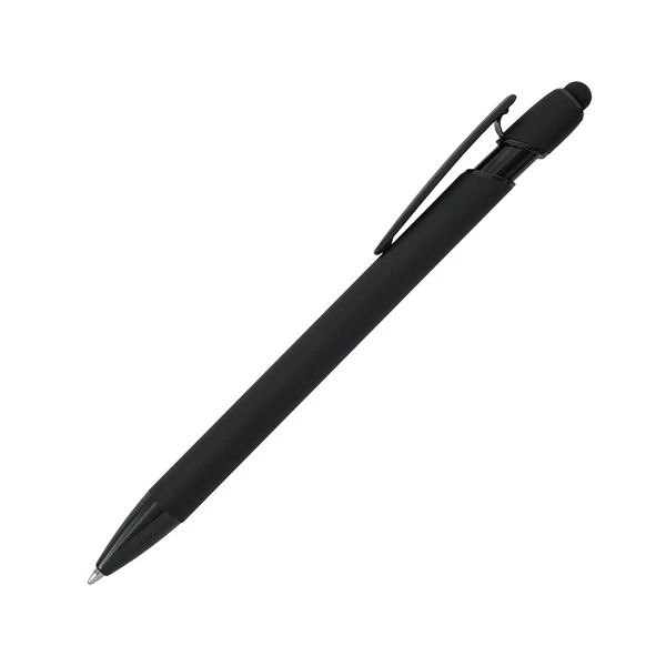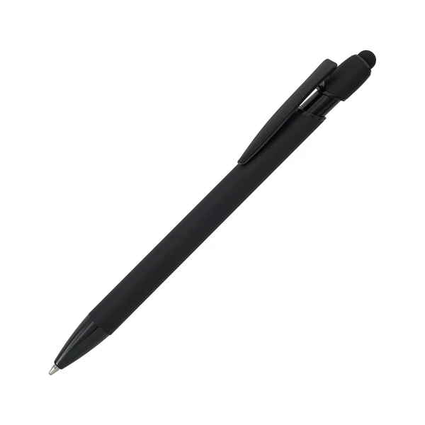 Aluminiowy długopis o przyjemnym w dotyku, satynowym wykończeniu z czarnymi elementami. Wyposażony w końcówkę do ekranów dotykowych. Niebieski wkład.