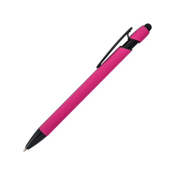 Aluminiowy długopis o przyjemnym w dotyku, satynowym wykończeniu z czarnymi elementami. Wyposażony w końcówkę do ekranów dotykowych. Niebieski wkład.