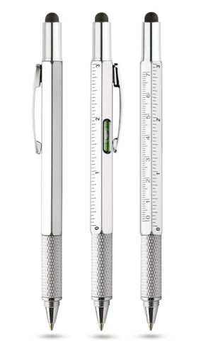 Wielozadaniowy długopis dla każdego fana majsterkowania. Gadżet wyposażony jest w dwie miarki (centymetry i cale) umieszczone na korpusie oraz małą poziomicę. Natomiast pod nakrętką z touch penem znajduje się dwustronny śrubokręt mocowany za pomocą magnesu - poręczny i wygodny w użyciu. Znakowanie możliwe na korpusie.