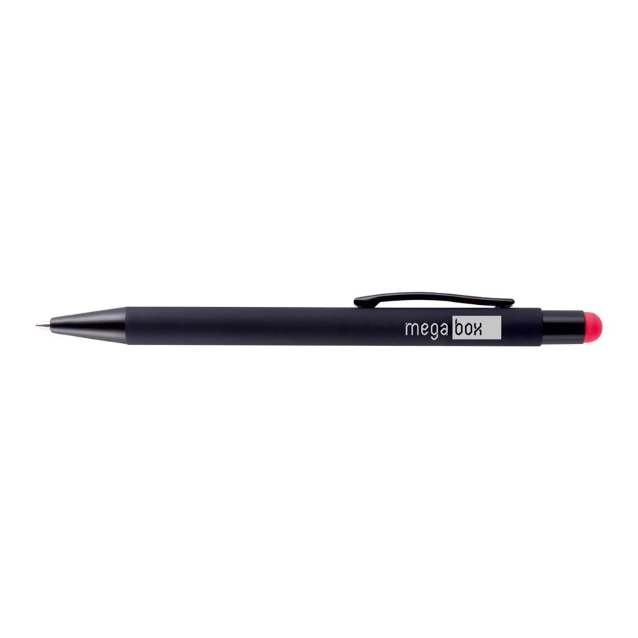 Długopis z czarnym trzonem, posiada gumowe wykończenie, kolorowa końcówka touch pen umożliwiająca obsługę ekranów dotykowych, grawer ukazuje matową powierzchnię w kolorze białym, wkład w niebieskim kolorze, produkt wykonany z aluminium i plastiku