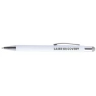 Długopis, touch pen, biały trzon, matowe wykończenie, grawer ukazuje lustrzaną powierzchnię w kolorze zbliżonym do gumowej końcówki