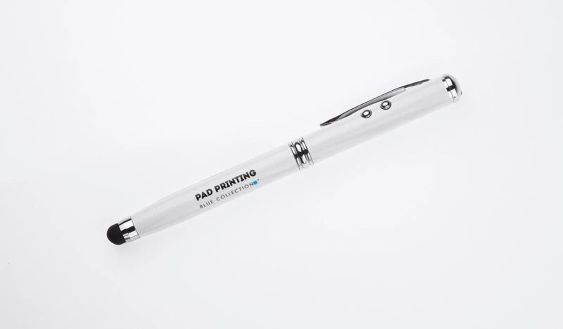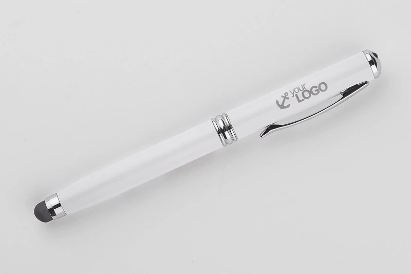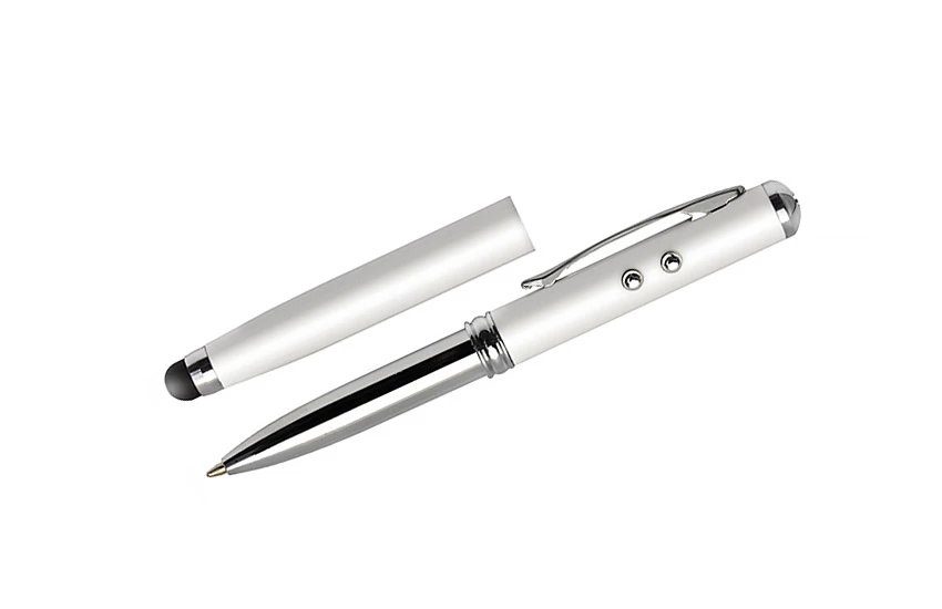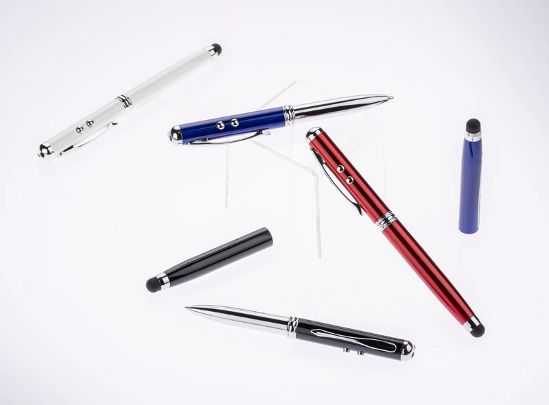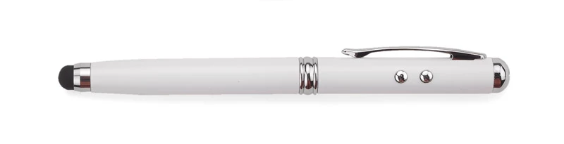 Długopis wykonany z metalu łączący aż cztery praktyczne funkcje: długopis, touch pen, wskaźnik laserowy, latarka. W jednym przyrządzie mieści się wszystko czego można potrzebować w czasie prezentacji multimedialnej lub innych biznesowych spotkań. Zgodnie z dyrektywą Unii Europejskiej (2006/25/EU) i Normą Polska ( PN-EN 60825-1:2005) wskaźnik posiada naklejkę informującą o niebezpieczeństiwe użytkowania. Logo wygrawerujemy.