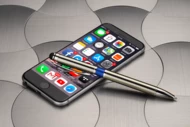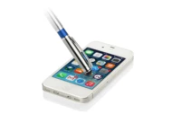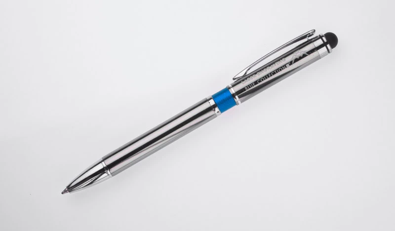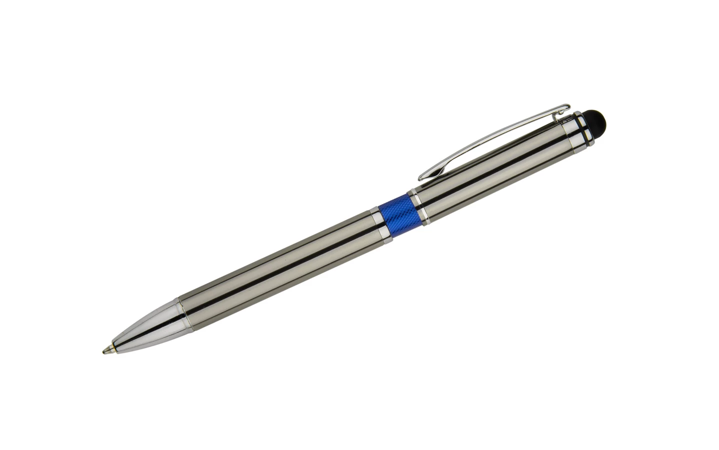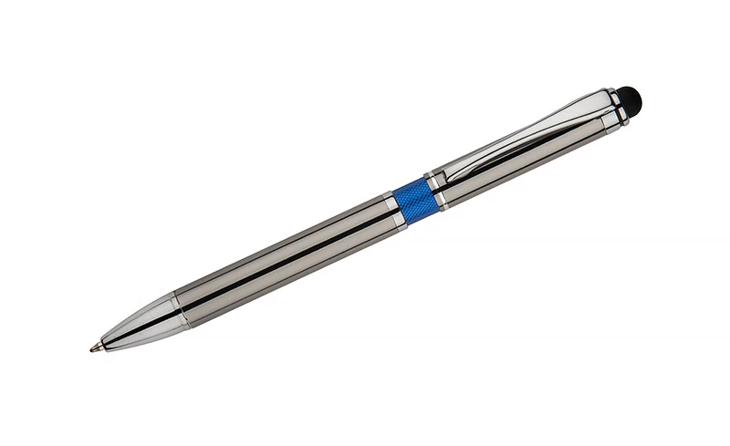 Elegancki metalowy długopis z kolorową aplikacją na korpusie oraz touchpenem.