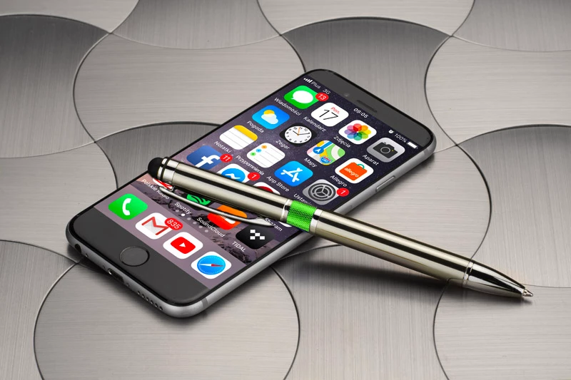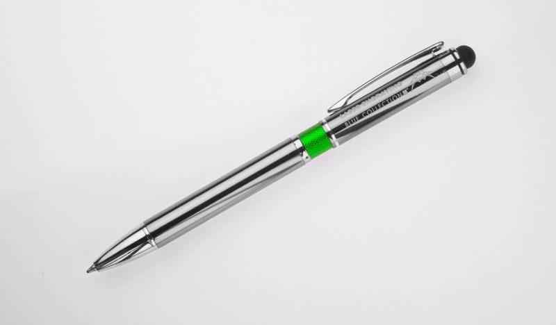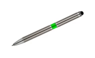 Elegancki metalowy długopis z kolorową aplikacją na korpusie oraz touchpenem.