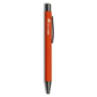 Długopis z kolorowym trzonem i szarymi elementami, posiada gumowe wykończenie, wkład w niebieskim kolorze, produkt wykonany z aluminium, plastiku i metalu