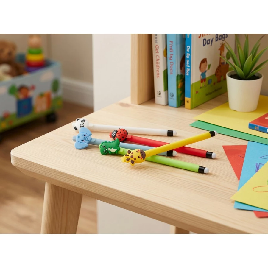 Długopis wymazywalny „zwierzątko” z kolorowym trzonem, występuje w 5 różnych wzorach sprzedawanych losowo: słoń, żyrafa, dinozaur, panda i biedronka